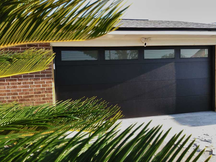 This install is a black C.H.I. Model 2147 Skyline Flush garage door in Panama City, FL. The door comes in 7 colors, with 188 colors available in powder coating. Seven wood tones are also available ranging from walnut to carbon oak. The long frosted windows provide natural light in the garage as well as privacy.